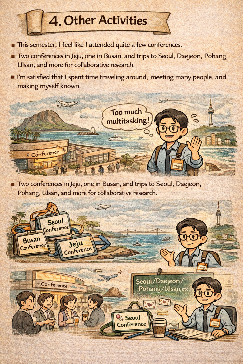 - 국내 제주 학회 두번, 부산 학회 한번, 그리고 공동연구를 위한 서울/대전/포항/울산 등등..